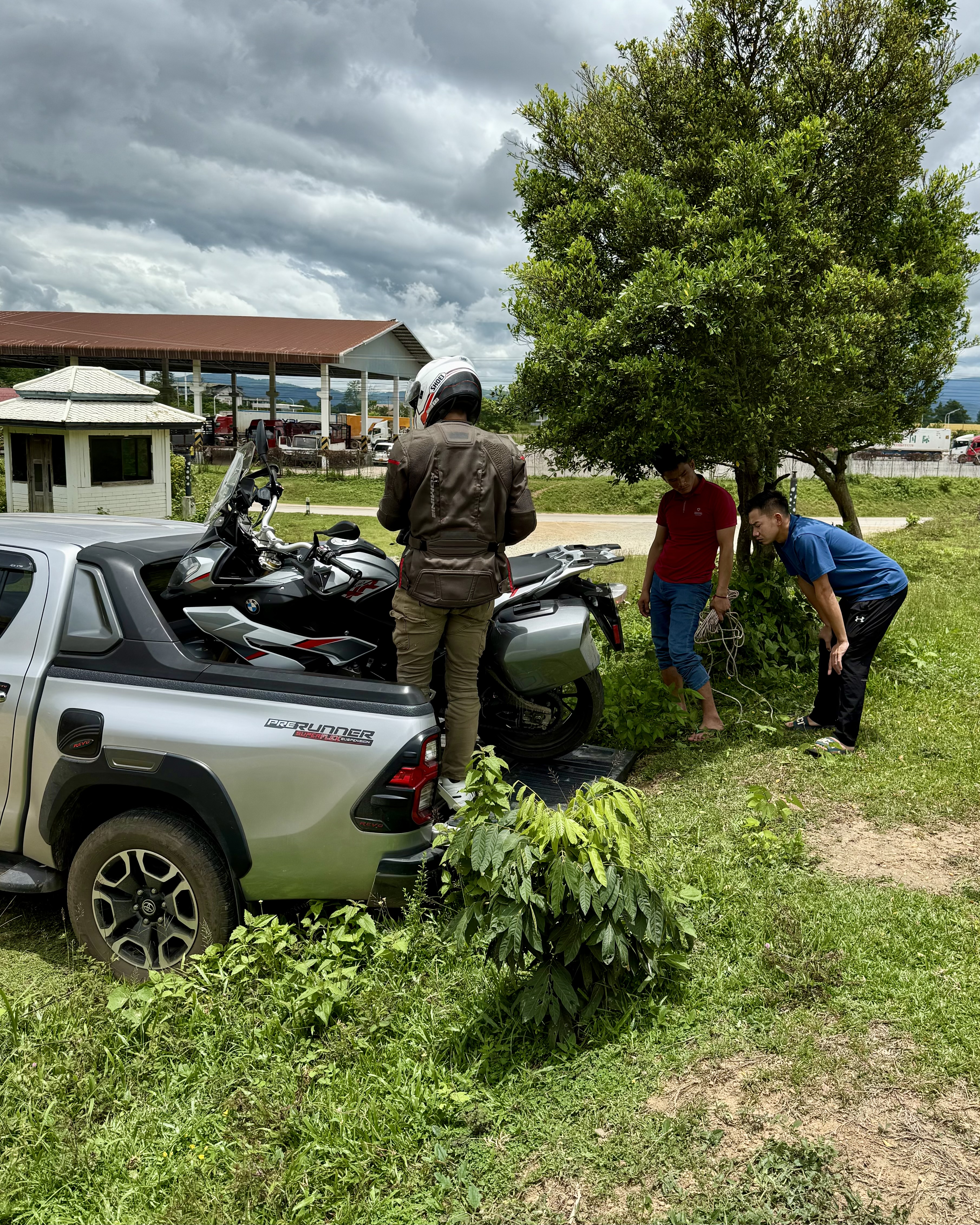 I was definitely a doubter as we waited for them to come up with a solution. They beckoned us to follow, and they led us to a grassy field with a few natural dirt banks. After hunting around the field for the best bank, they reversed the Hilux with the trunk door down to the bank, and voila, a perfect ramp had been found.