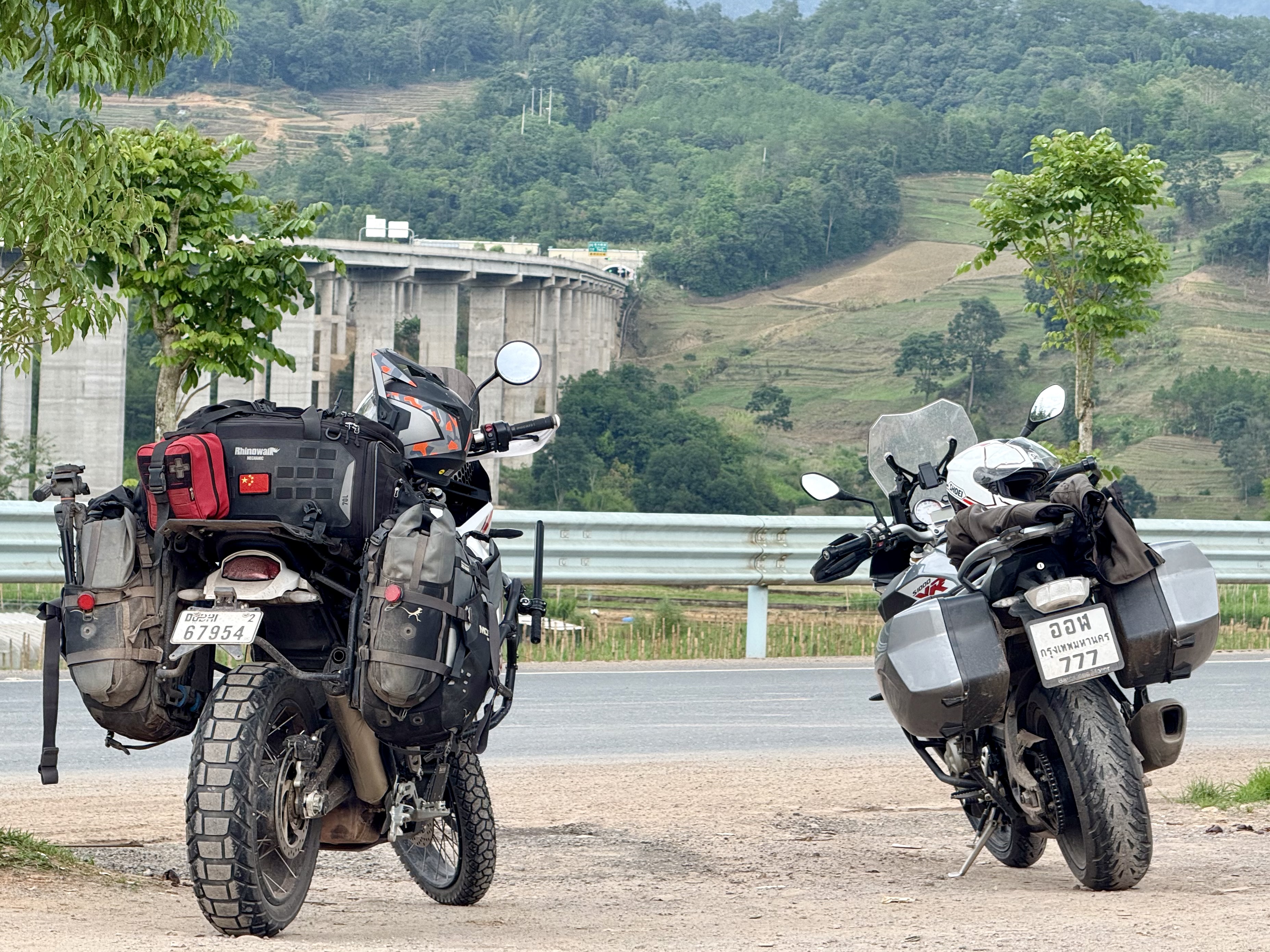 - In Laos it was trying to not destroy the bike’s suspension and fall in bad road conditions. And now in China, it is a sort of zen where I am riding at the speed limit(ish), and spend my time taking in my surroundings, and letting thoughts come and go while riding. Such thoughts were as trivial as “I wonder what the ratio of (1) the number of tunnels I’ve passed through in China in the last 2 days, to (2) The number of tunnels I had passed through ever in my life” [I think excluding metros (and only counting road tunnels), that ratio is bigger than 1:10 (i.e. in the last 2 days I think I have gone through >10% the total number of road tunnels I have ever gone through in my life).], or “I wonder how solar installations here have affected electricity prices in rural areas”. [I didn’t dwell on this one for too long]. With the road more or less floating in the air, rather than following the contours of the land, it is a completely different feeling. There is a strange sense of distance between the road and the surrounding environment - as though it is a movie or screen saver going by. Small rural villages on mountaintops are tens of metres away, but feel a world apart from the perfectly paved bitumen roads, and well manicured hedges at the centre and edges of the road.