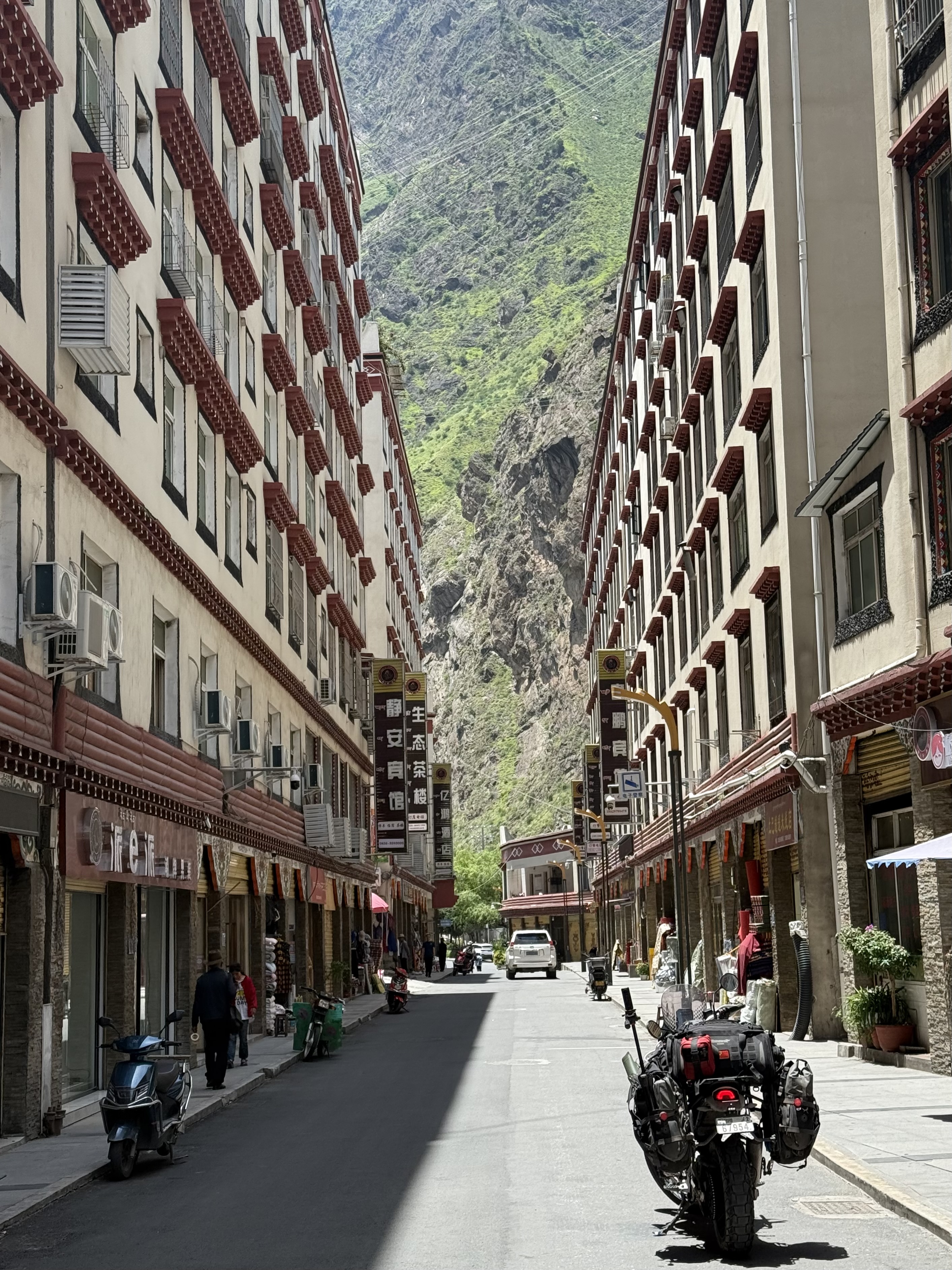 I’m getting more comfortable riding my bike up steep terrain and navigating tight turns. First gear, enduro mode, patience is all you need. And after countless hairpins, I reached the village. A bit nervewracking, but quite fun. The village itself was relatively uneventful. A hall had Tibetan techno sounding music, but all else was quiet. No stores, or anything. I turned around halfway through the village (I was afraid of being overly ambitious; and it seemed to get steeper and narrower as I ascended).