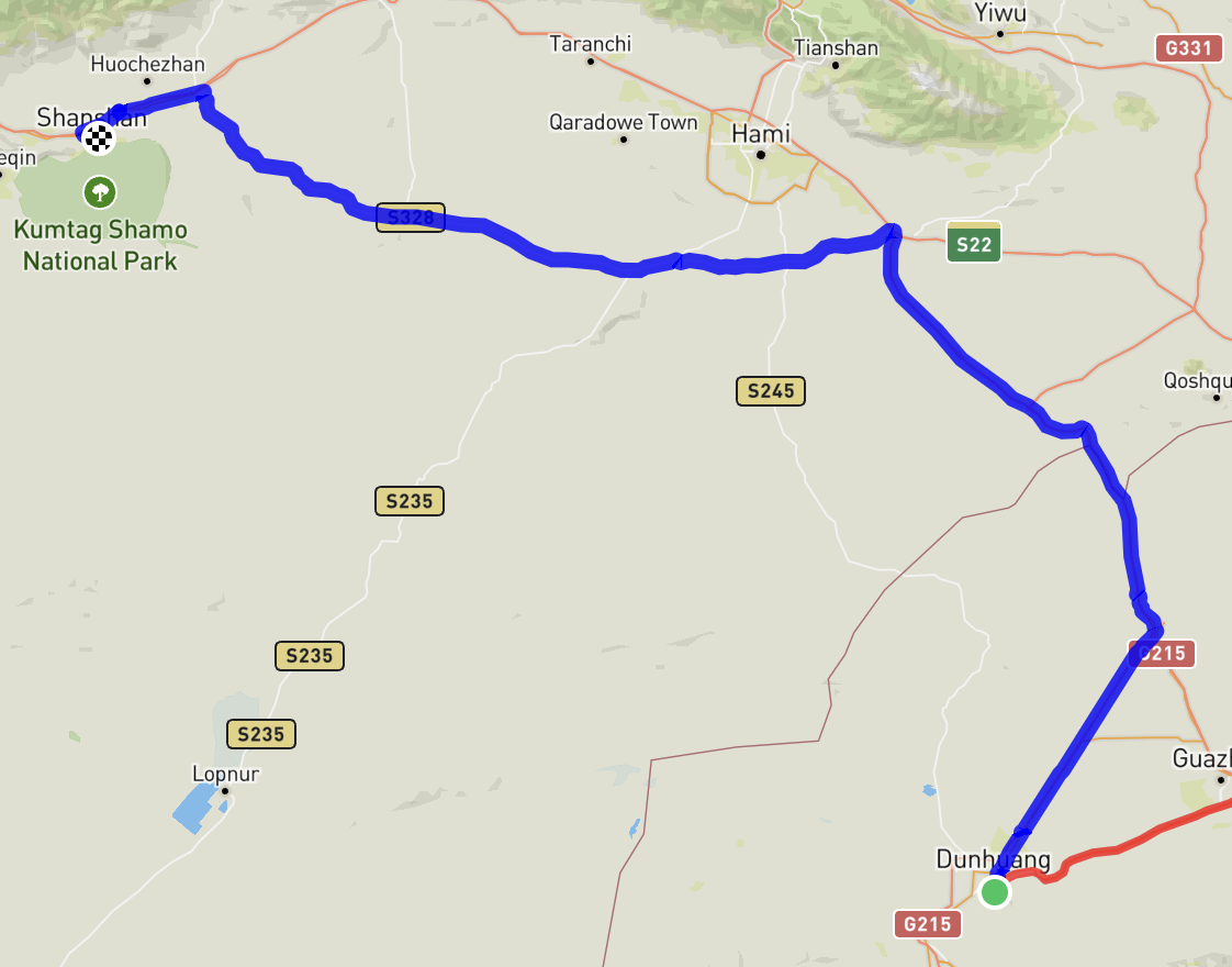 Today’s ride is likely the longest (planned) day I’ve had this entire time; 750KM from Dunhuang to Shan Shan in Xinjiang. I set off at ~10am with intentions to also explore a national park en route, that was recommended by the driver from yesterday. With a guide and a driver (and accompanying car, by regulatory requirement), I’ve given all my luggage save my tank bags and crash bar bags to the driver, so it is a bit more fuel efficient and less tiring to ride. Quite nice to effectively have a support vehicle in tow (and very helpful with planning, police etc), but definitely not the cheapest thing to organise.