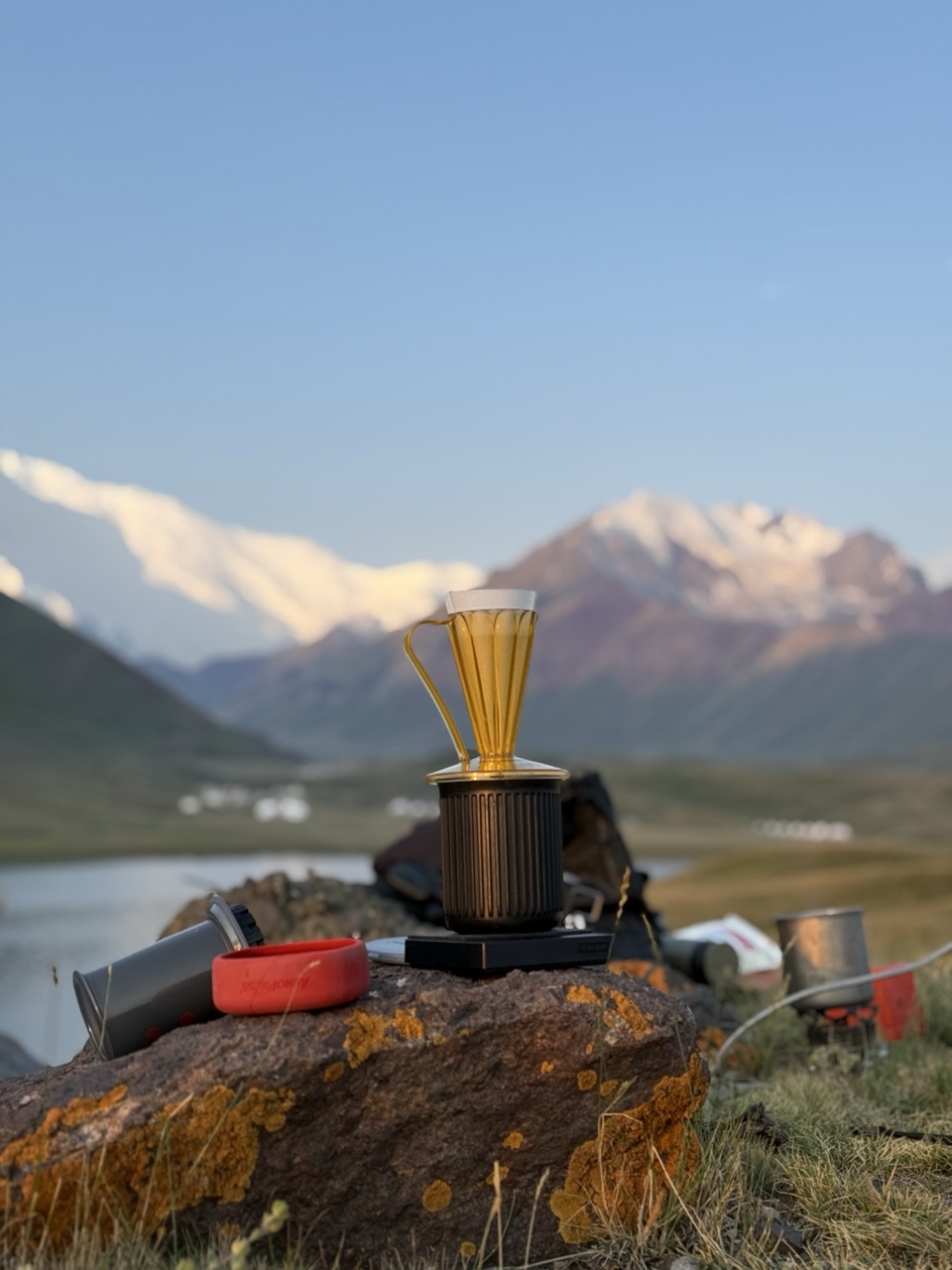 The first stop after the border was Karakol lake. This is a bizarre landscape. The waters look tropical and light blue…although it is a bit TOO blue. The temperature is very cold, around 5-6 degrees. Around the lake is a ring of grass which shimmers from afar, such that you cannot tell if it is under water or above water. Outside of the ring of grass is a circle of white salt, with green-red-black lichen. And outside of this ring is black asphalt like rock with tall clumps of grass growing out.