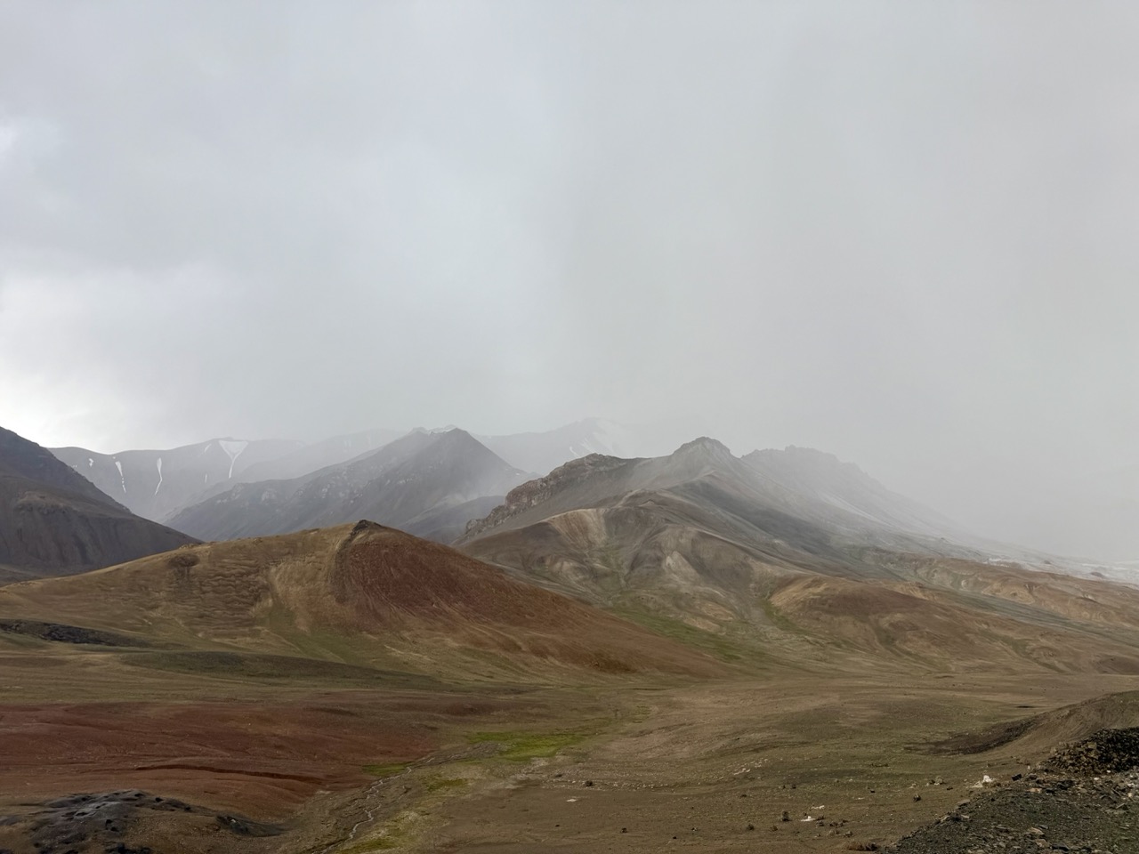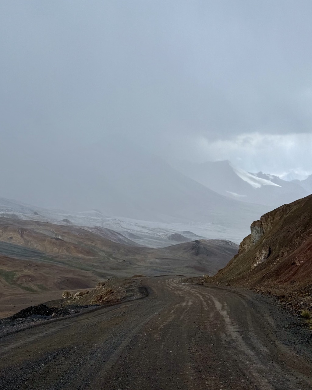 - hail The rain here is more like hail; surface temperatures are below 10 degrees, so likely sub zero in the clouds. In higher areas where temperatures are closer to zero, the ice gathers on the ground and turns into a paste of sorts; quite a challenge to ride through. It feels like riding through sand, only worse because the loss of traction is more sudden and much sharper.