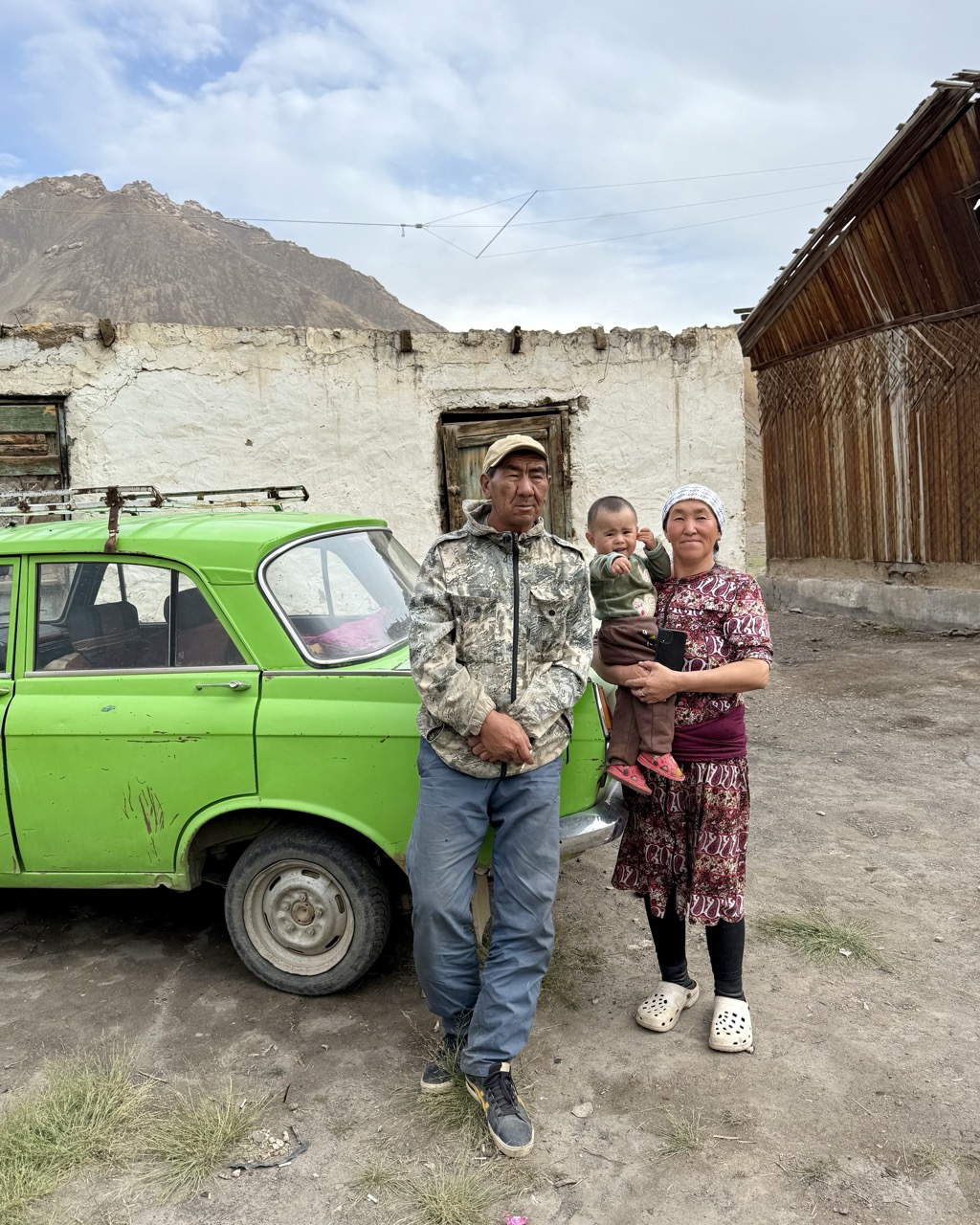 By evening we had crossed Ak-Baital pass, the highest point on the ride today at 4655 MASL (with icy roads on the way up), and spotted a lone compound with a bright green Lada. A passing cyclist had mentioned to us that there was a lovely couple living there, and that we could stop for food, so that is what we did, while evaluating the plan for the evening ahead (to camp or to stay somewhere, and if so, where).