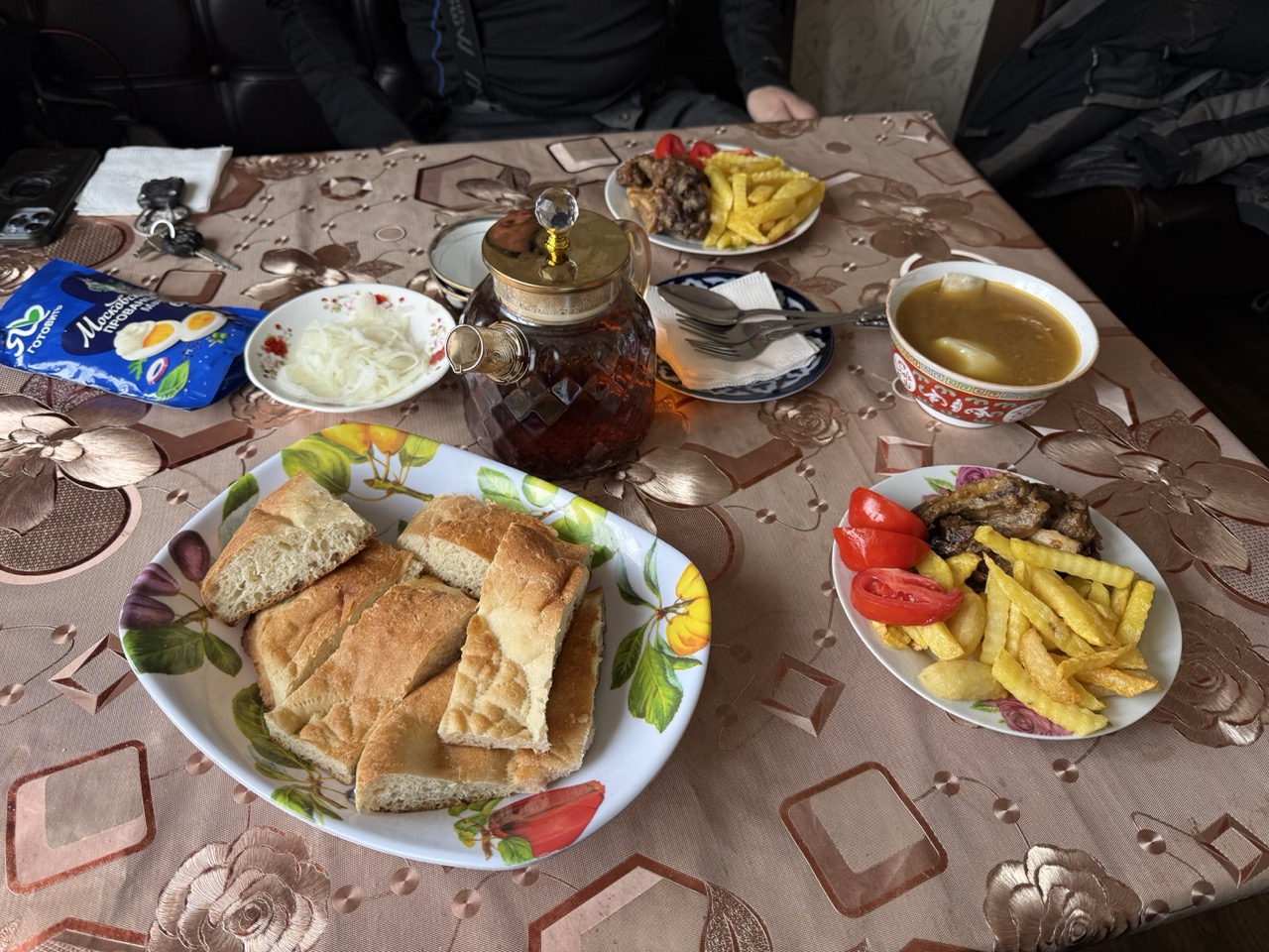 Funnily enough, while we were eating, we were joined by two Tajik folk. They had been driving electric cars and I had overtaken them long ago. One of them came up to me with a frown on his face and asked me why I flipped him the bird when he gave me a thumbs up. I was very confused, as i don’t remember interacting with him at all…until Cornelius mentioned that he was the one who did that (the guy had tried to stop Cornelius from overtaking him). I was honestly slightly concerned - I am extremely risk averse towards confrontation/adversarial situations with drivers when I am on my bike - but it seemed like the drivers brushed it off.