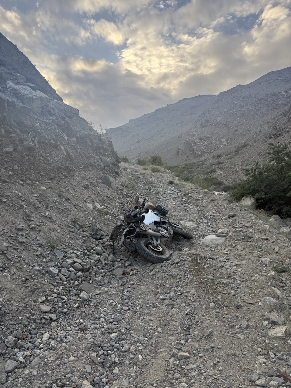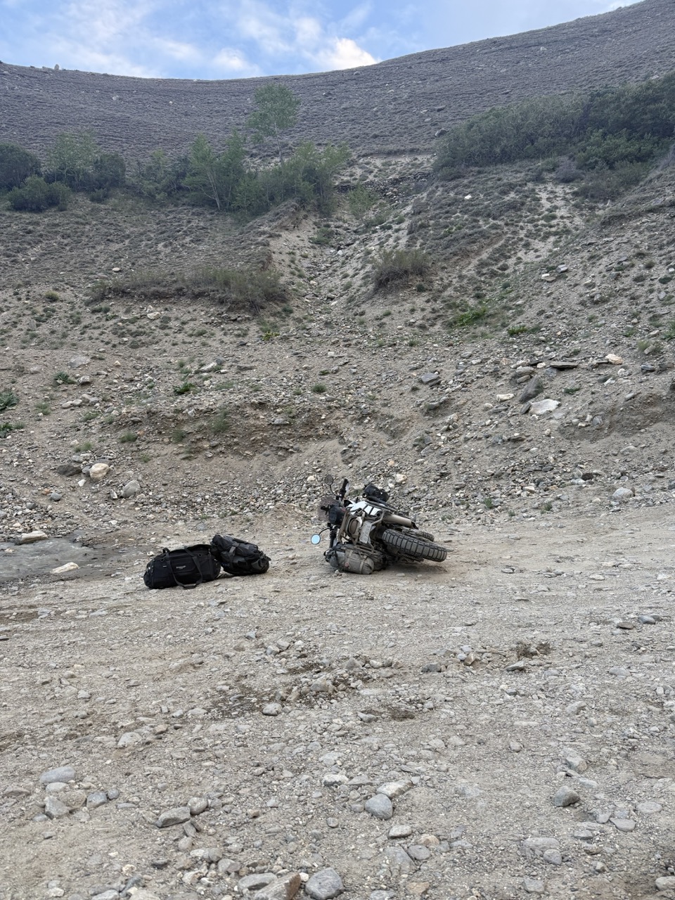 Exhausted, I decided to continue on to town, and started putting my luggage onto the bike once more…until the dirt beneath the kickstand gave way and the bike tipped over again!