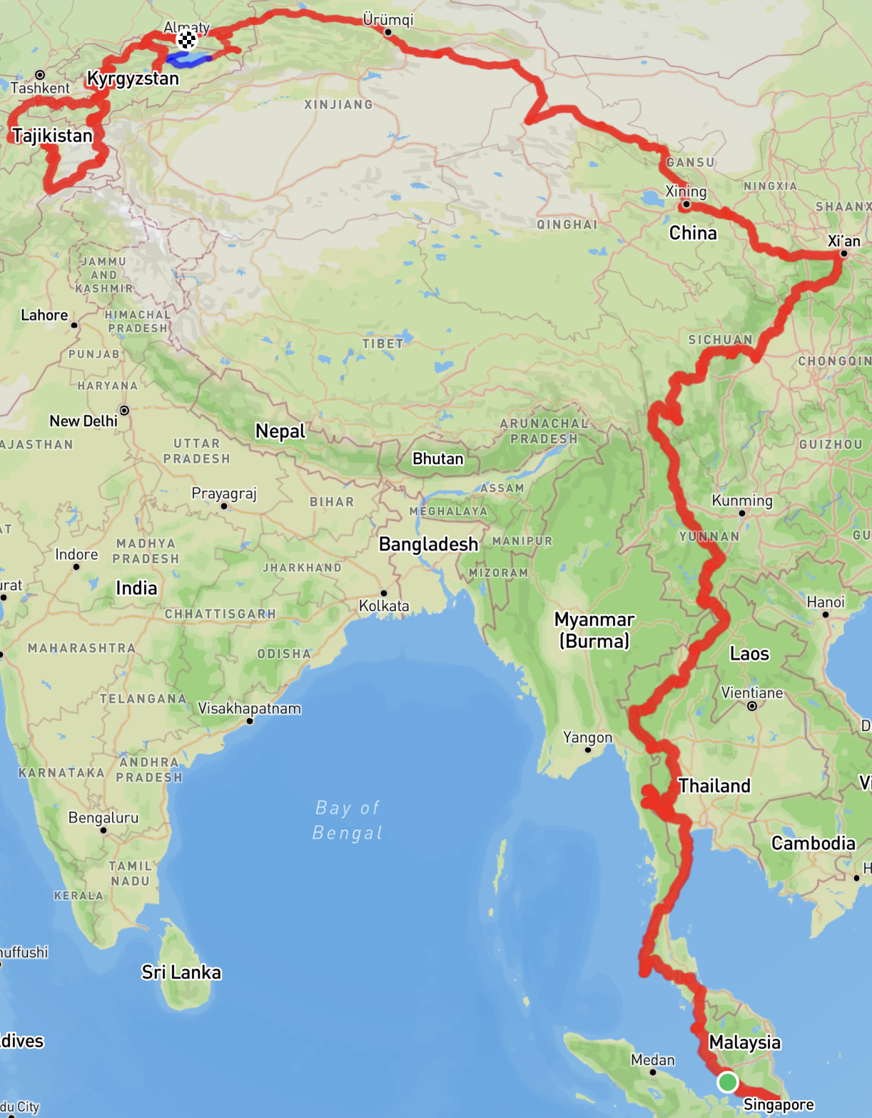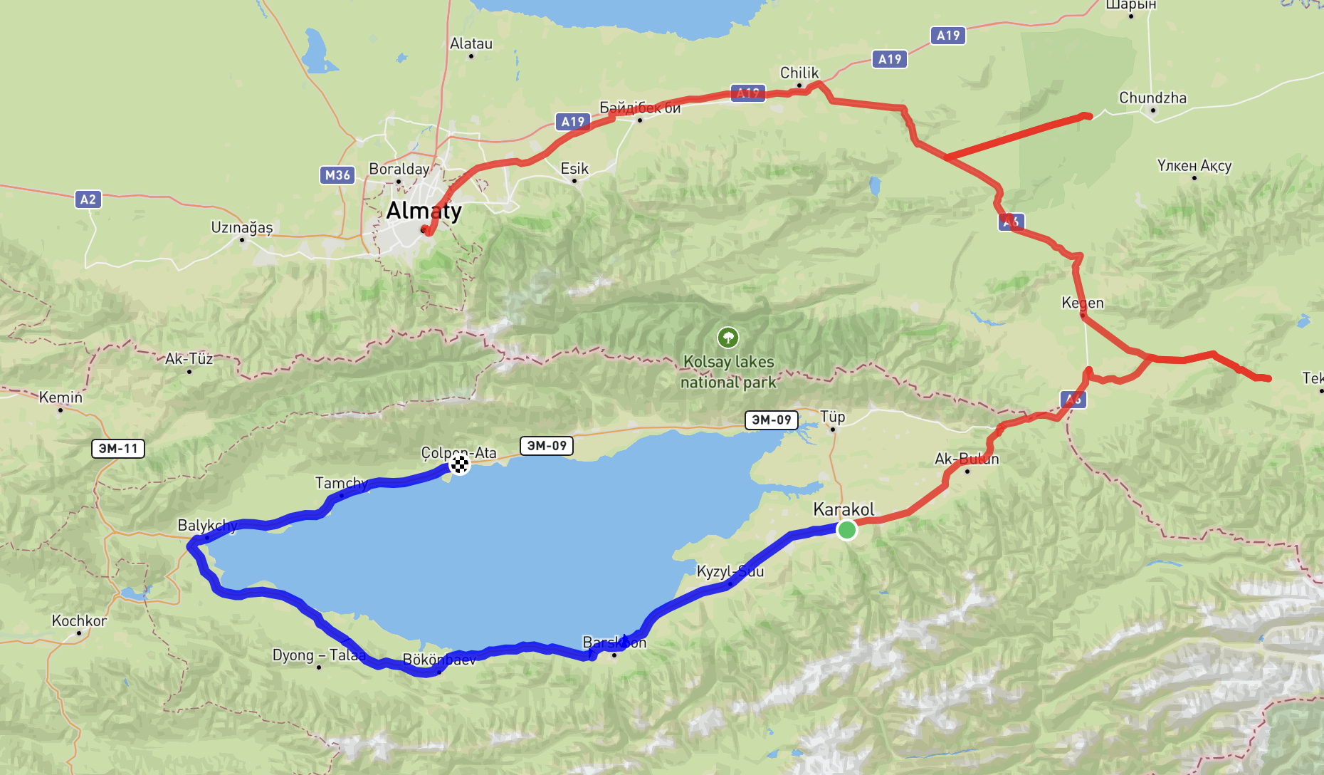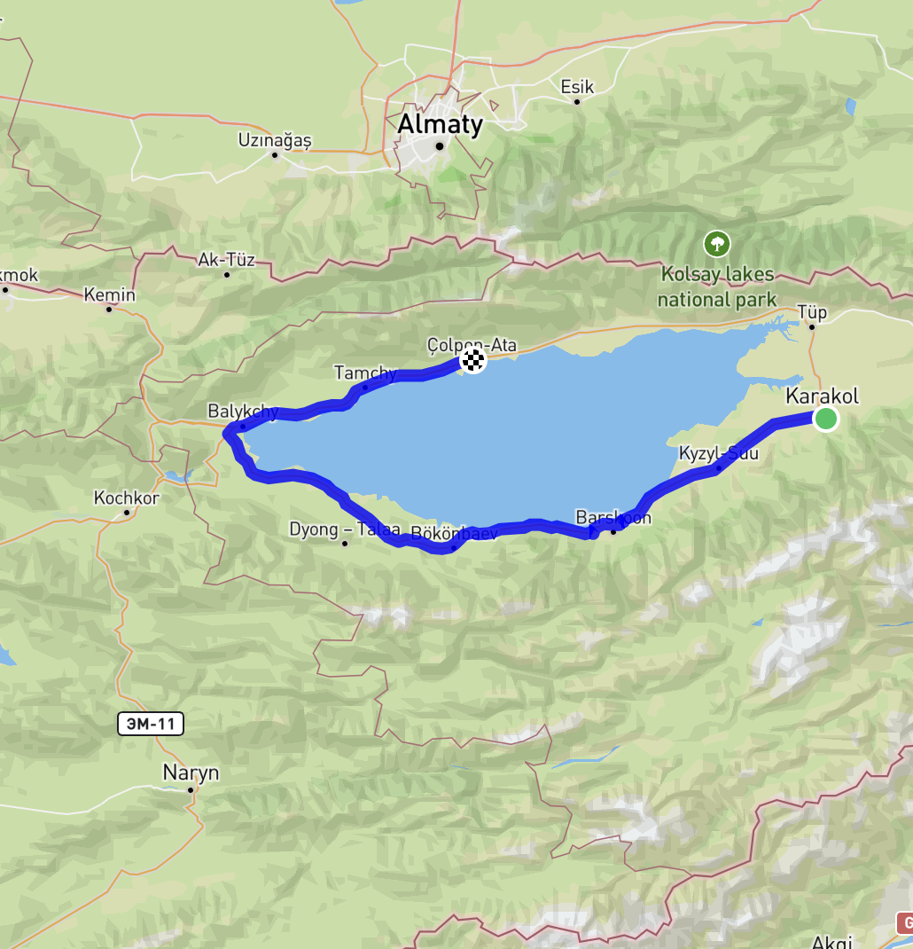 Today my route took me from the easternmost point (where Karakol is located) around the southern side of the lake, to the median point on the northern side of the lake (Cholpon-Ata).