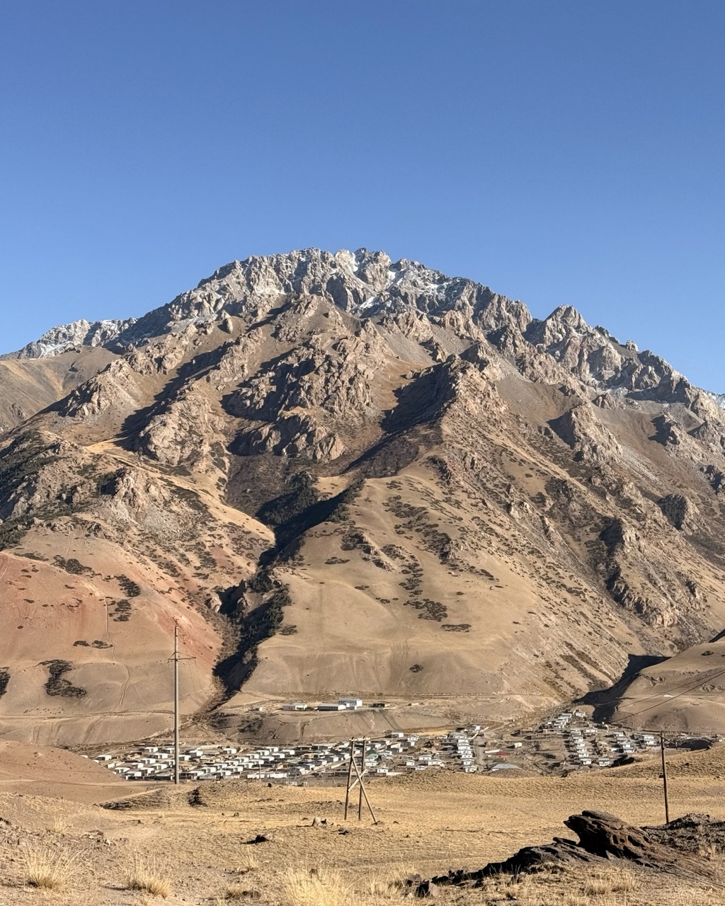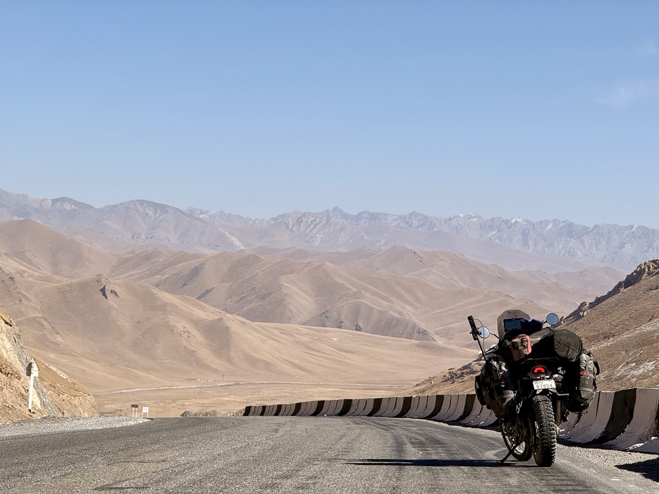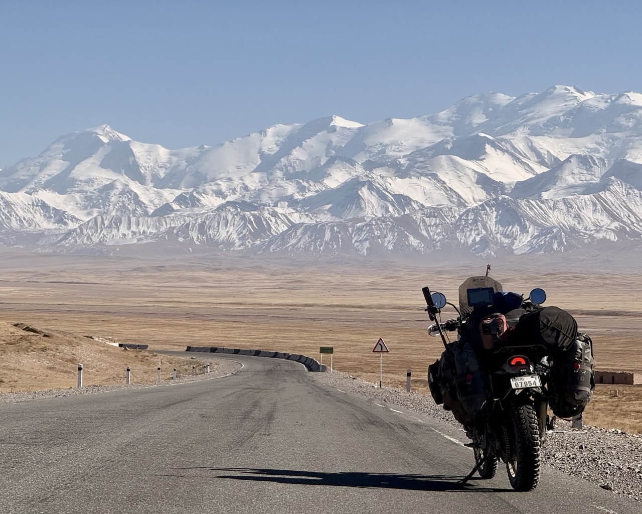 The going was at a very leisurely pace; Mauricio is a calm driver, and I followed at their pace for the drive south to Sary Tash along the M41. I had ridden this road a few months ago, on my way to Tajikistan, so I was curious as to what the landscape would look like. The weather was a bit cooler, the foliage along the way had turned from a light green to an autumn yellow, and grass had similarly dried out, but the landscape was not too different (compared to the route along the M41 to Toktogul Reservoir); contrary to my expectations, there was a tiny bit of snow on the mountain peaks, but the way was clear, and the snow did not reach the sides of the road.