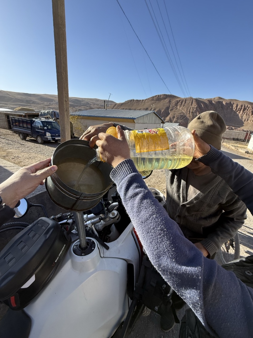 I spent 15 mins riding around the back streets until I came across someone driving their car, stopped them, and then asked if they knew where I could get fuel. Using my GPS’ map, they pointed to a house at the edge of the village.