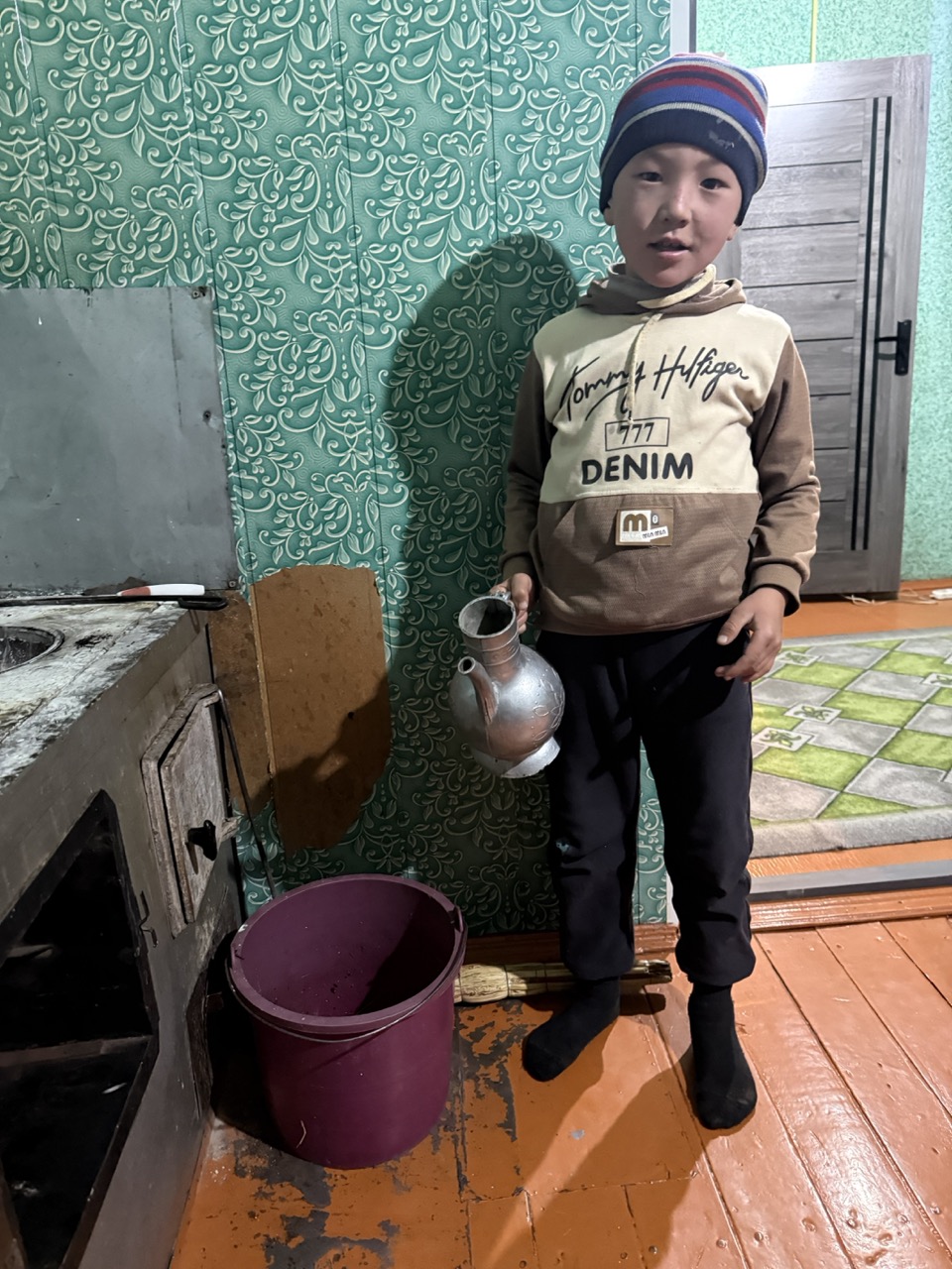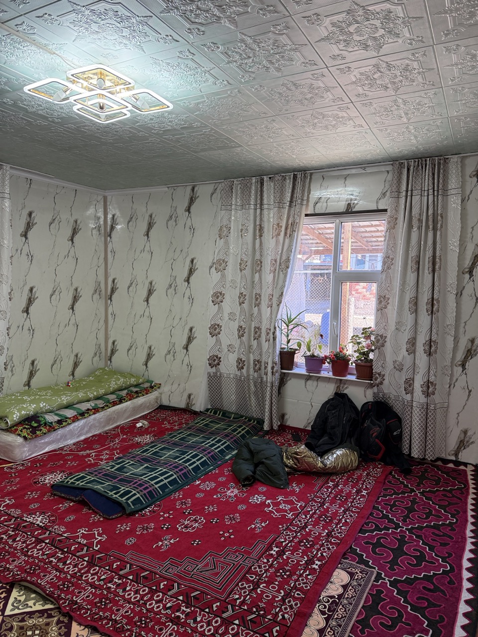 The accommodation was quite basic; a small house with a room filled with rugs and curtains, and a padded mat on the ground. It was a family of three; a mother and two sons. One was 8, and the other 21.