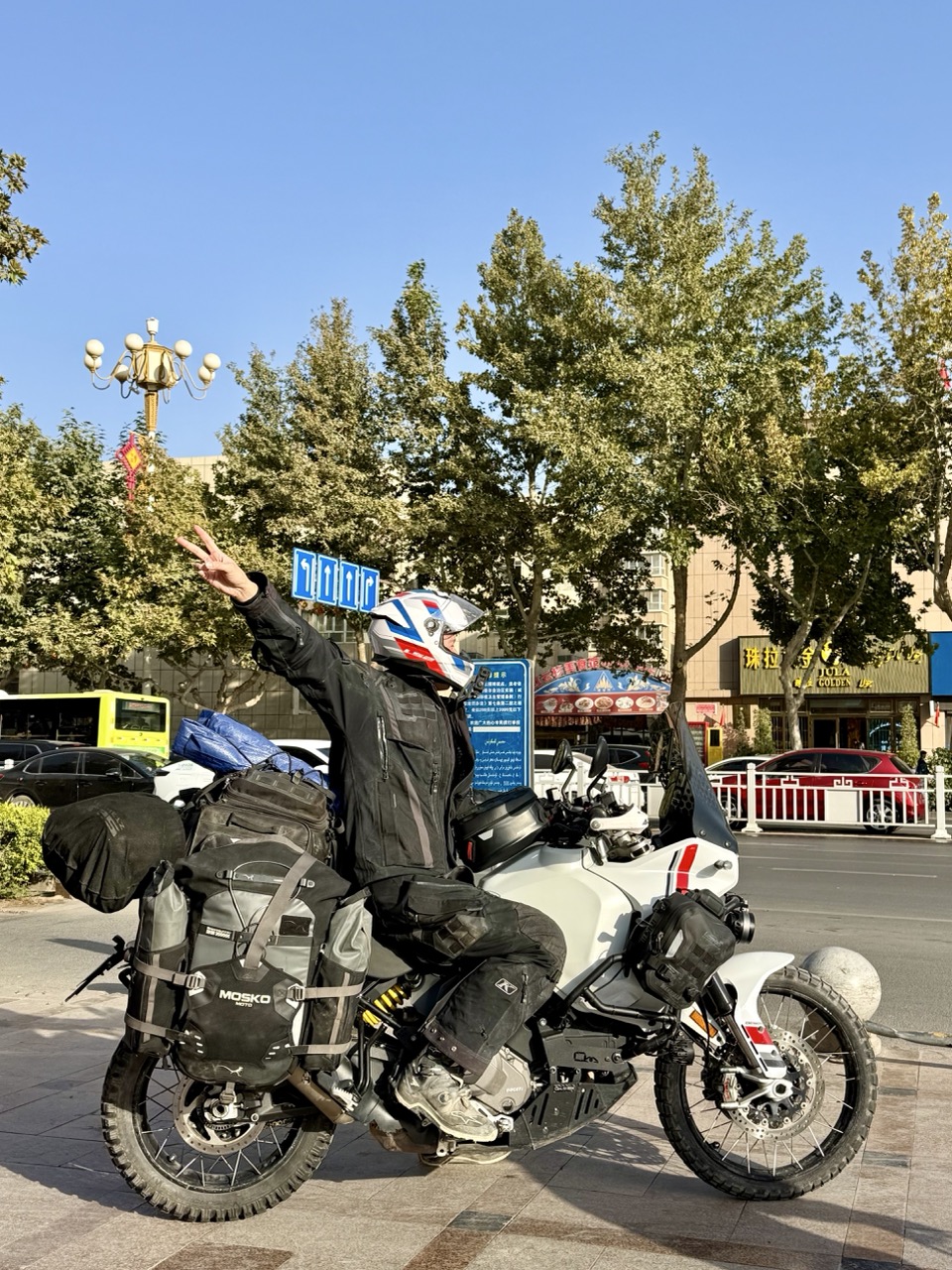 Then I met with the guide, filled up with the help of her ID card and then proceeded along the way. The road to the border ran mostly south of Kashkar, along autumn boulevards for most of the way. Altitude remained ~1500 and gradually increasing for this stretch, and there seemed to be a mix of agriculture, but also police/military presence. This presented itself through there being guards sitting on the roadside at most of the intersections along the way; presumably controlling access to whatever facilities lay down the road.