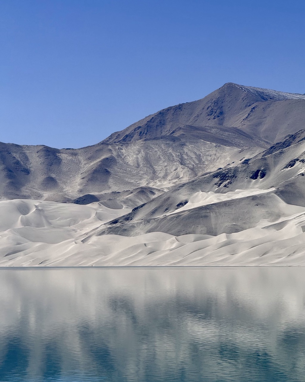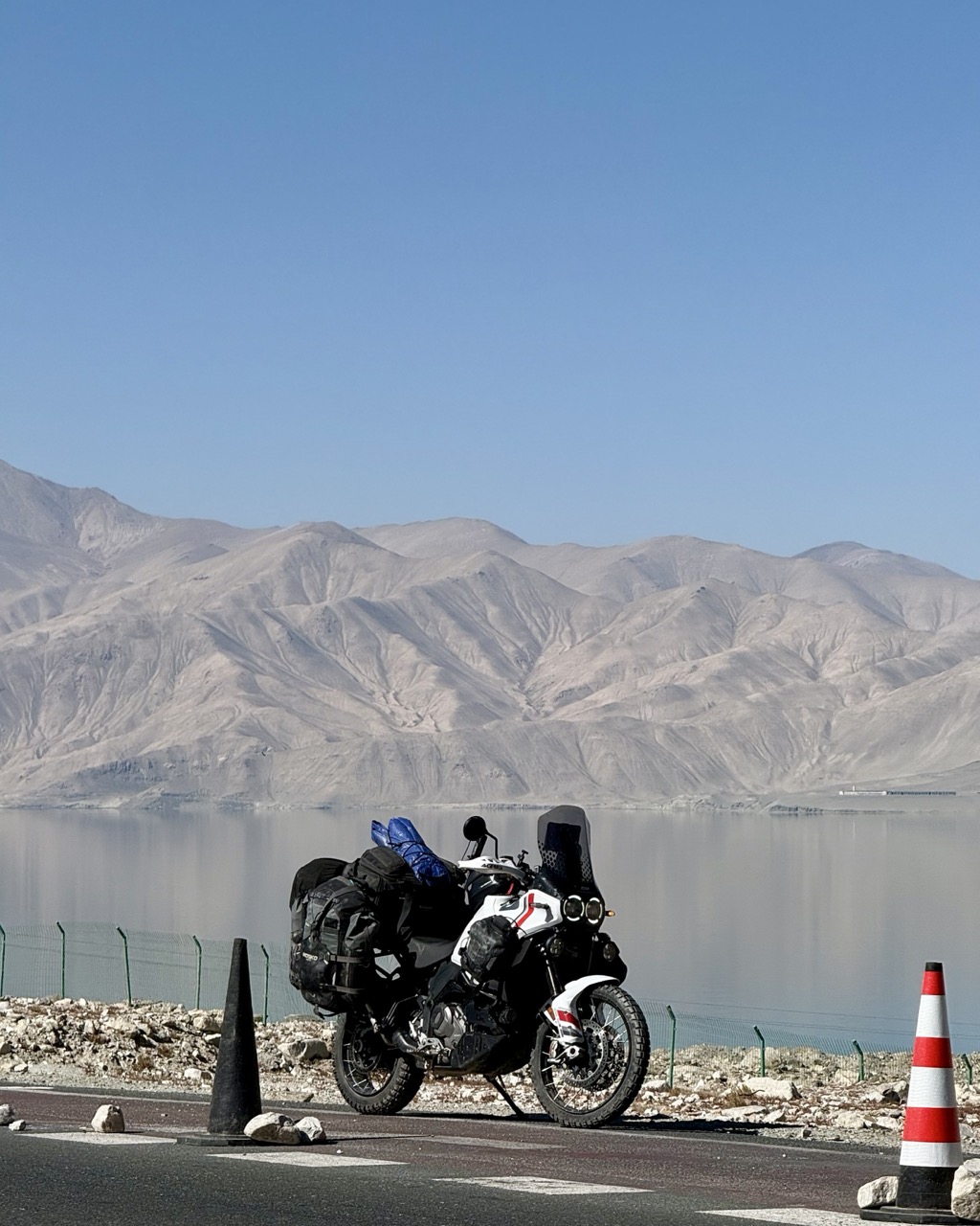 30 minutes later I arrived at “白沙湖” (white sand lake) which is a spectacular lake in the mountains (in its current form, a hydropower dam), with rolling sand dunes which appear quite out of place on the mountain shores. This was quite a sight to behold. I skipped the tourist attraction itself (there were hundreds if not thousands of people walking along the viewing platforms) and parked by the roadside in a closed off shoulder for some pics, before continuing on.