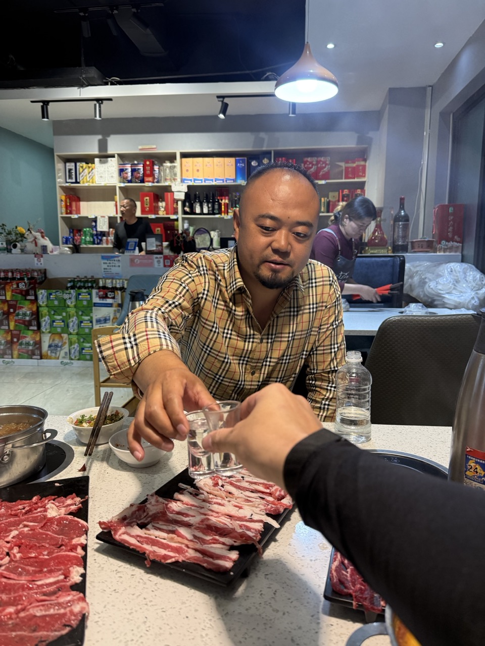 He was originally from Chengdu, and had his family (wife and 13 year old son) there. It was an interesting interaction; there was some conversation, we were each on our phone for other parts, he was videocalling his family and friends as he ate, and telling them about me. We started drinking together; first his home distilled moonshine (made of roasted corn) which tasted like a stronger vodka (and was actually pretty good), then a bottle of little lamb baijiu that I bought, and then wusu beers of local origin.